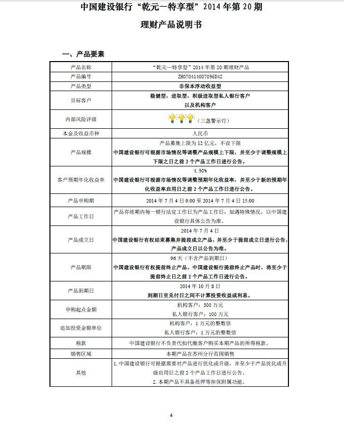 “乾元—特享型”2014年第20期理财产品风险揭示书及产品说明书(苏州)