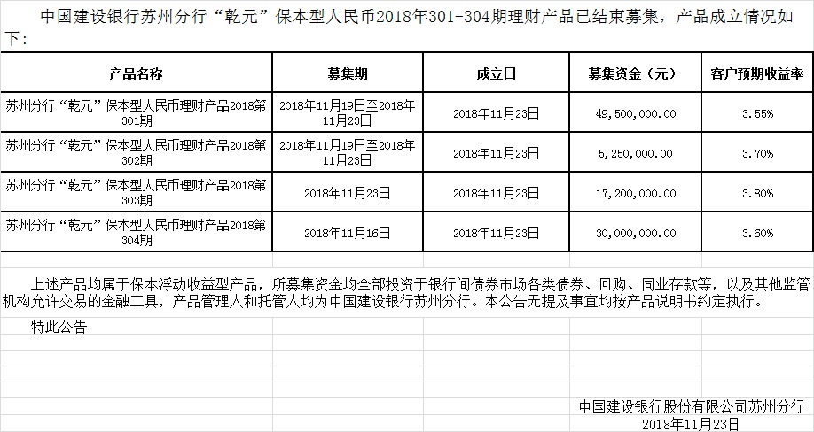 中国建设银行苏州分行“乾元”保本型人民币2018年301-304期