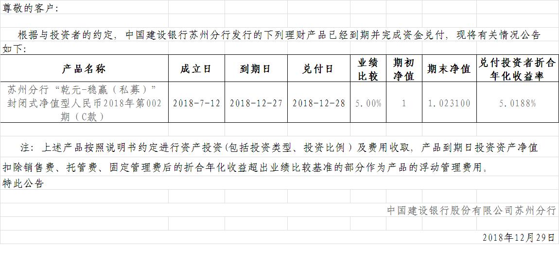 中国建设银行理财产品终止及清算公告