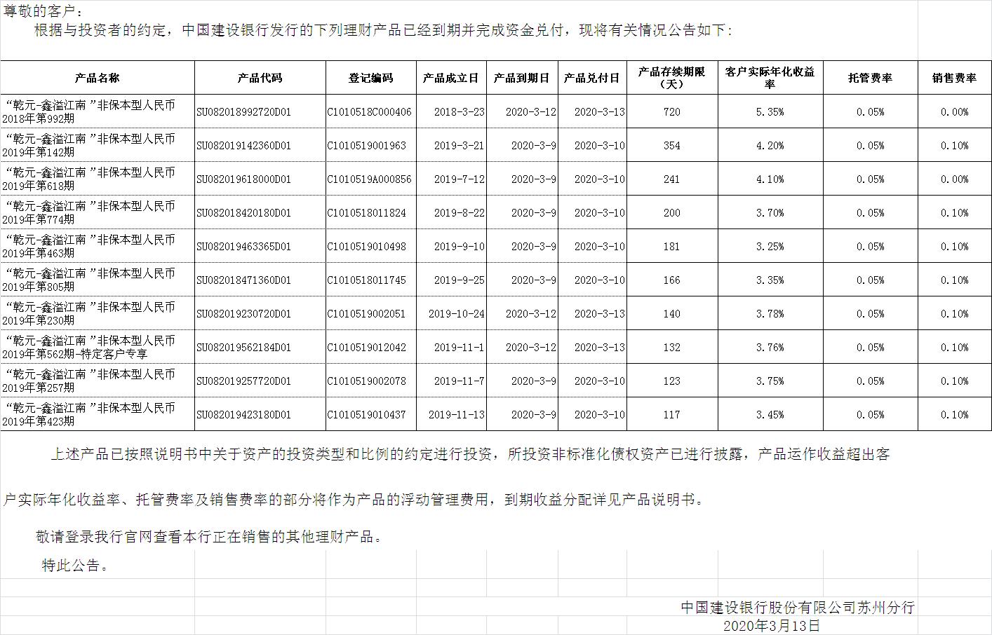 中国建设银行理财产品终止及清算公告